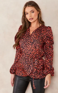 Long Sleeve wrap top in Black / Orange abstract Polka Dot print. V neck Wrap blouse with belt has drape detail on shoulders and lastics on long sleeve cuffs. Fixed with the lastic on the waist as well for relax fitting.