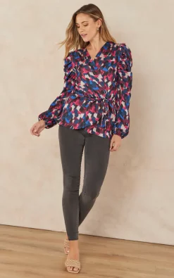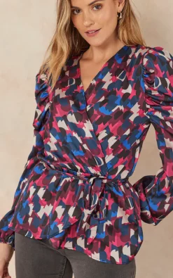 Long Sleeve wrap top in Blue/Fuchsia Geometrical print. V neck Wrap blouse with belt has drape detail on shoulders and lastics on long sleeve cuffs. Fixed with the lastic on the waist as well for relax fitting.