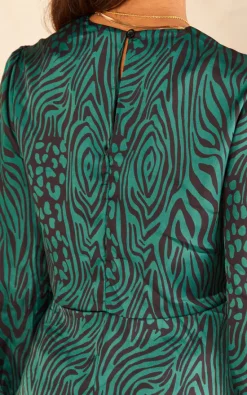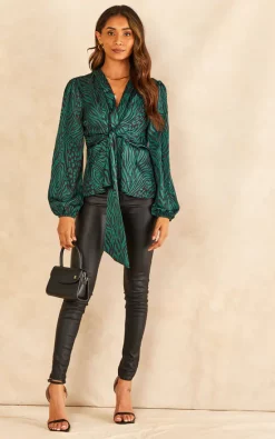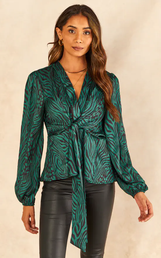 Long sleeve Wrap over Knot style Satin Top / Blouse in Green Animal print.
