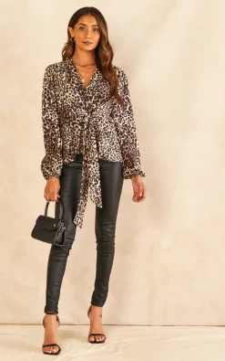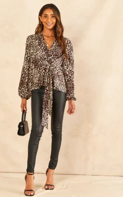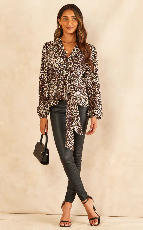 Long sleeve Wrap over Knot style Satin Top / Blouse in Classic Leopard Animal print.