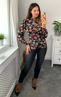 This top is all about the colour combo. See how the autumnal tones really stand out against the black fabric? Topped off with pretty balloon sleeves, deep cuffs and keyhole detail at the neck, it looks so smart and stylish. Team this top with an A-line skirt to jazz up your office wear, or go with denim and boots to elevate your everyday style.