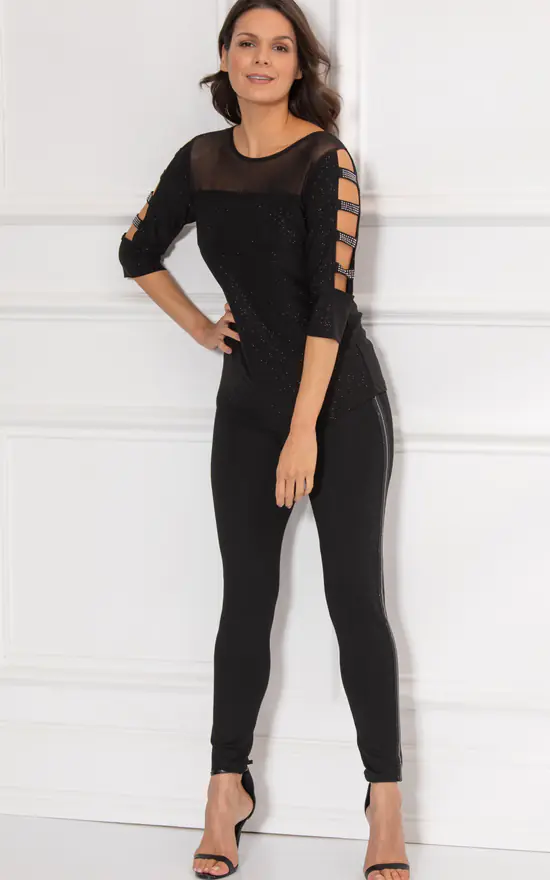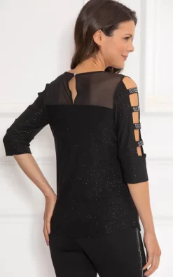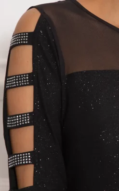 The only top you need this festive season, this cut out sleeve top boasts mesh and sparkle detail, three quarter sleeves and keyhole button fastening to the back. Pair with smart trousers and heels for a stunning event look. Length 66cm.