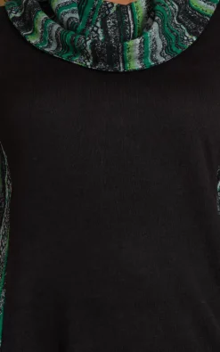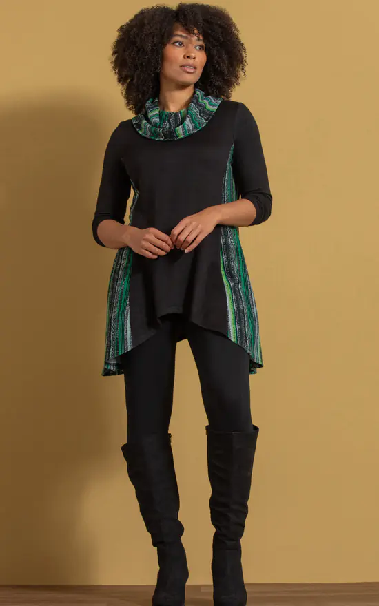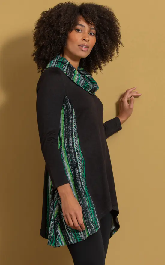 Our dipped hem tunic top will become one of your go to tops of the season. Crafted in a lightweight soft knit with long sleeves, printed panels to the sides that add style and cowl neckline that adds extra warmth. Back length to longest point 84cms.