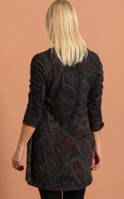 Cover up in one of our stylish lightweight knitted tunic tops as the colder weather sets in. The fit and flare design ensures a flattering fit and we love the paisley dot design, ruching to the three quarter length sleeves and the round neckline completes the design. Wear yours with leggings and boots. Back length 85cms.