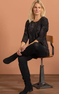 Cover up in one of our stylish lightweight knitted tunic tops as the colder weather sets in. The fit and flare design ensures a flattering fit and we love the paisley dot design, ruching to the three quarter length sleeves and the round neckline completes the design. Wear yours with leggings and boots. Back length 85cms.