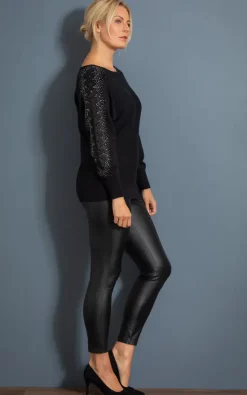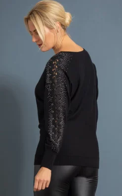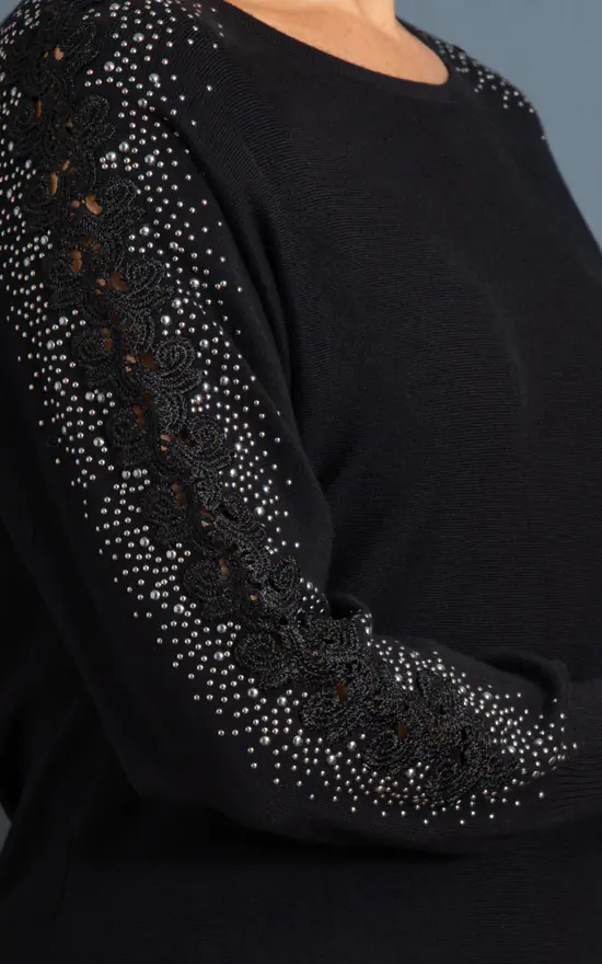 We love this black batwing soft knitted jumper, versatile and stylish to throw on with a pair of jeans or smart faux leather trousers. Decorated to the long sleeves with silver coloured embellishment and feminine lace, we have also added a round neckline and ribbed cuffs and hemline. Back length 65cms.