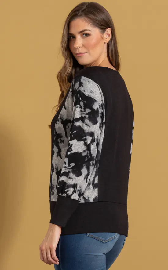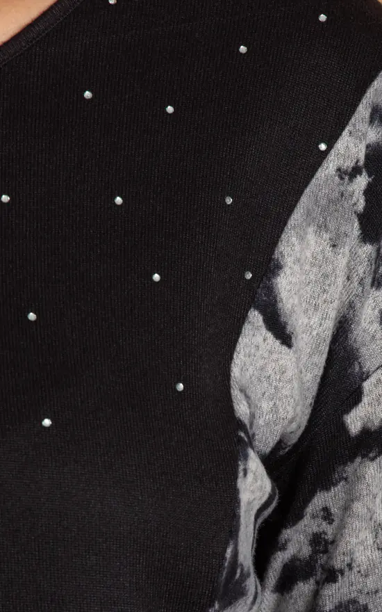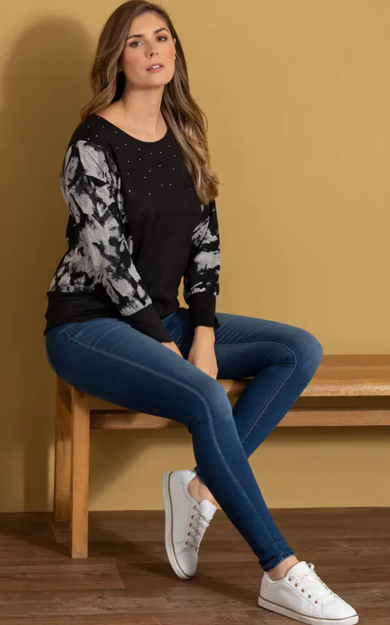 Lightweight knitted batwing top with printed sides and long sleeves that will add a stylish touch to your week day or weekend looks. We have added a scattering of embellishment to the front under the round neckline and added plain cuffs to the long sleeves and to the deep hemline. Back length 65cms.