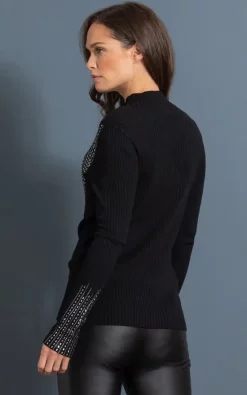 Need a black rib knitted top with a touch of glam then meet our must have top. Fitted design with embellished cuffs on the long sleeves and embellished front that is cascading down from the high neckline. Dress yours up or down to suit your style. Back length 61cms.