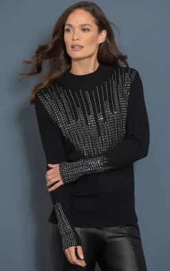 Need a black rib knitted top with a touch of glam then meet our must have top. Fitted design with embellished cuffs on the long sleeves and embellished front that is cascading down from the high neckline. Dress yours up or down to suit your style. Back length 61cms.