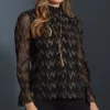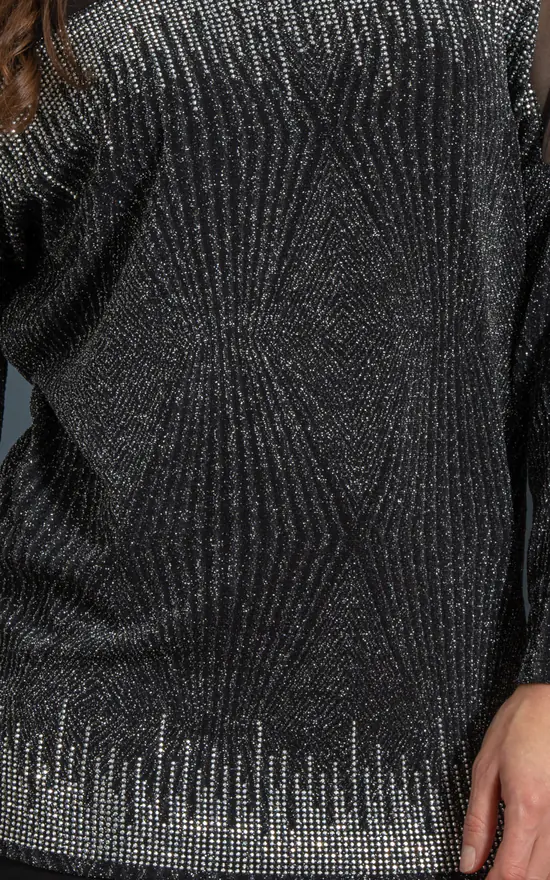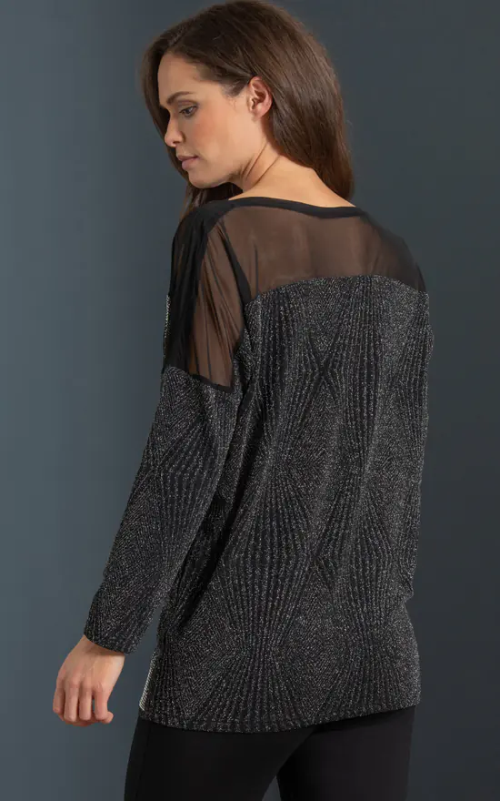 Relaxed fitting embellished top that will take you through the evening in style. Crafted in a black and silver coloured shimmer fabric with black mesh to the round neckline and shoulders. Finished with long sleeves and silver coloured embellishment to the front for extra detail. Back length 69cms.