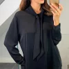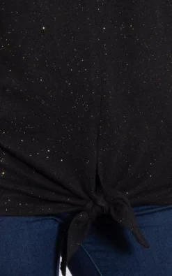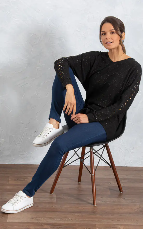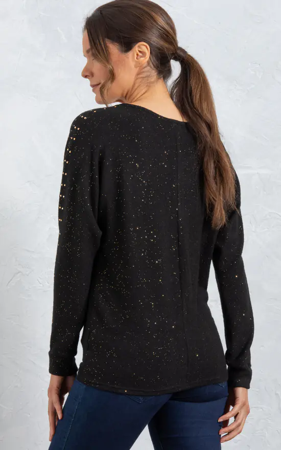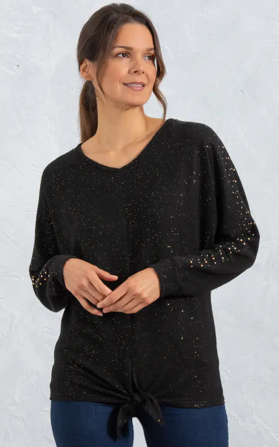 Relax in style in our soft black batwing top. Featuring long sleeves, flattering v neckline and self tie to the front hemline for added interest. Our soft lightweight top has an all over gold coloured shimmer that catches the light with movement and gold coloured embellishment that runs down the long sleeves to add a touch of glam to your off duty looks. Back length 66cms.