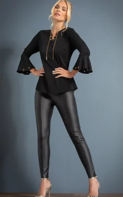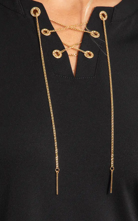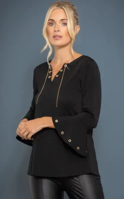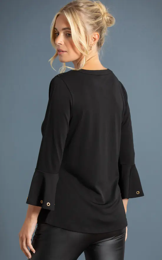Flattering black jersey crepe top that will have you feeling chic and stylish as you step out. We have added embellished gold coloured eyelets to the front and finished the neckline off with a thin gold coloured chain, the sleeves are three quarter length and also have been finished with embellished eyelets to the fluted cuffs. Back length 65cms.