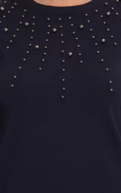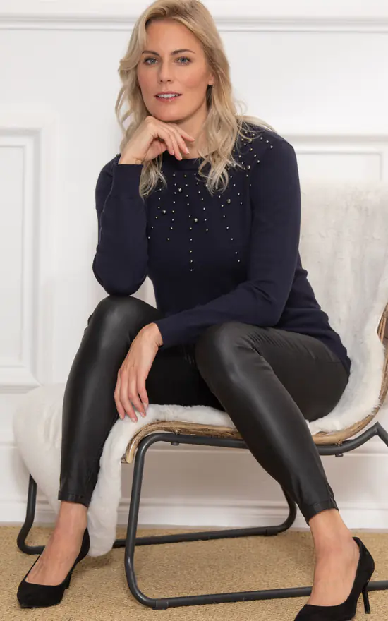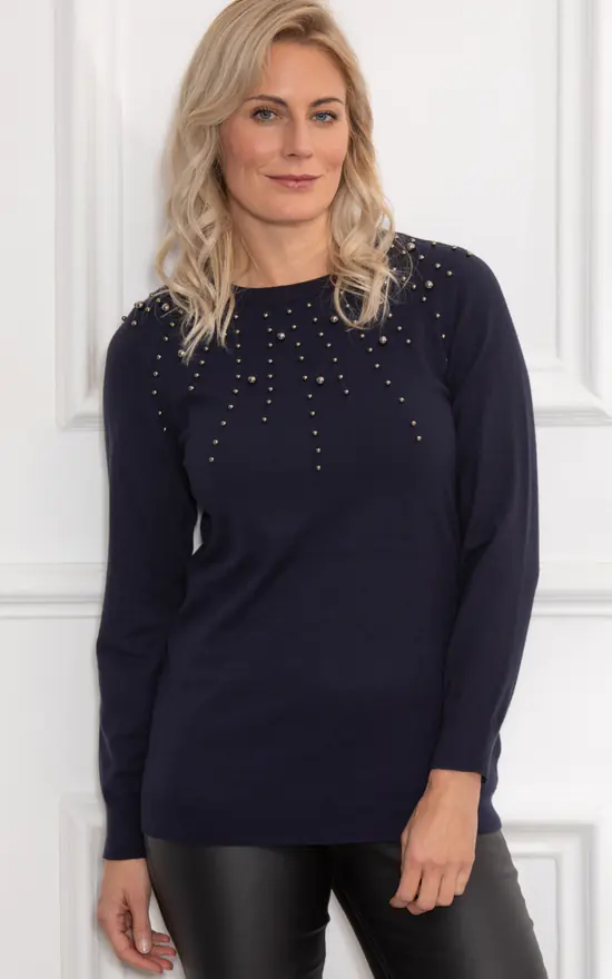 Lightweight long sleeve jumper with round neckline and pearl embellishment to the front. Pair with dark wash jeans or leggings and smart shoes for a twist on smart casual. Length 68cm.