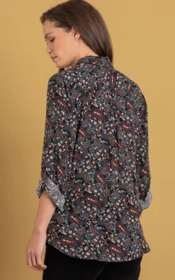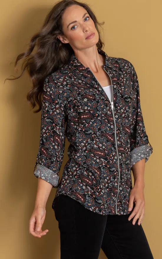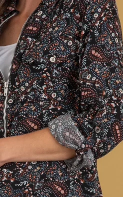 Smarten up your casual looks with our floral and paisley printed top. Designed in a flattering fit with button fastening front pockets, zip fastening throughout the front and long sleeves with button back tabs for a chic finish. Pair with a cami top and casual bottoms to complete your look, wear open or closed. Back length 71cms.