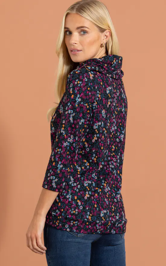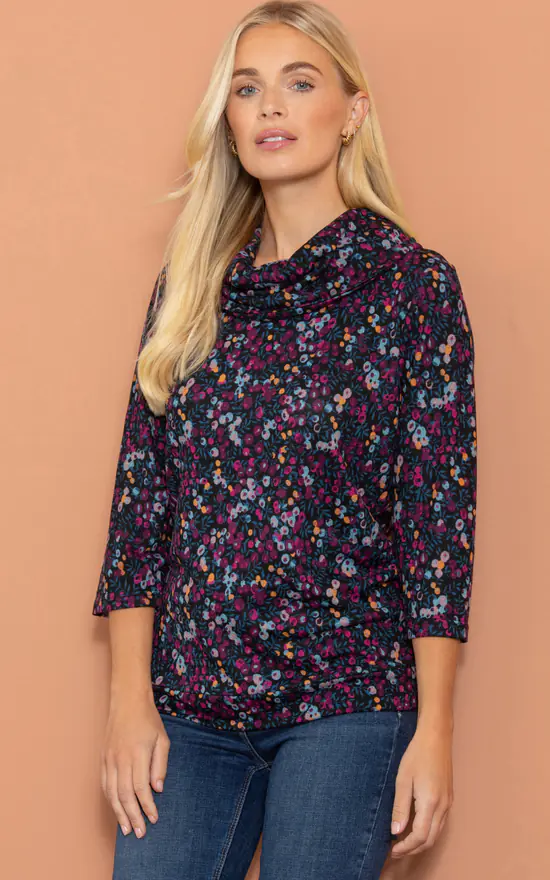 Say hello to your new go to top, crafted in a floral printed lightweight soft knit. Semi relaxed fit with three quarter length sleeves and flattering cowl neckline, team with casual bottoms for laid back chic.