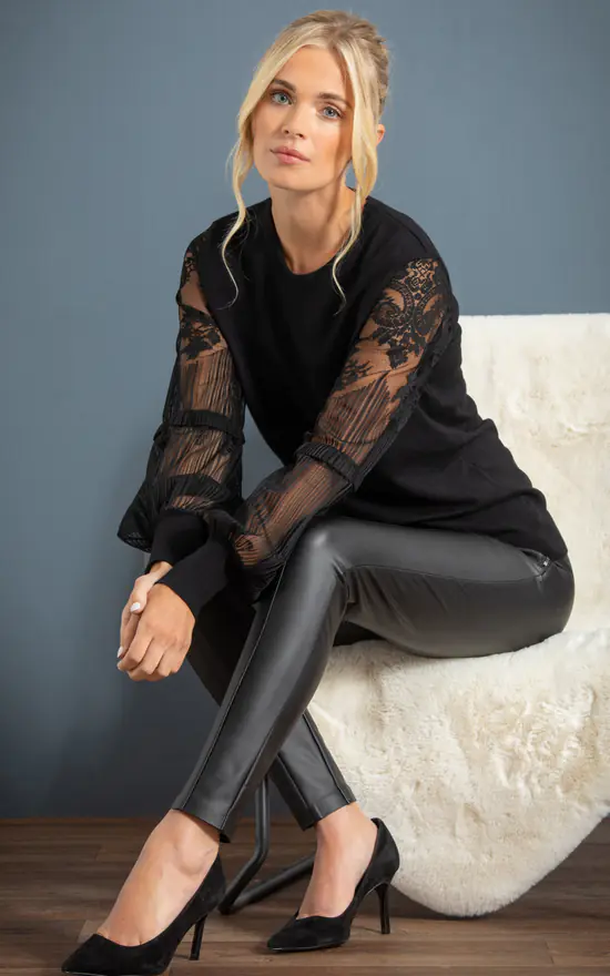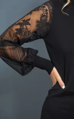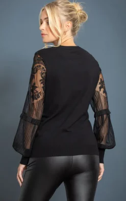 Classic black lightweight soft knitted jumper but we have taken ours to the next level and added feminine full mesh long sleeves with deep ribbed cuffs. Semi fitted with round neckline, wear yours with smart bottoms for dinner dates. Back length 62cms.