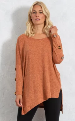 Soft lightweight knitted oversized tunic in a rust hue. Featuring round neckline drop shoulders and button detailing to the long sleeves, our go to tunic also has side split detailing to the asymmetrical hemline and looks perfect teamed with skinny jeans. Back length 80cms.