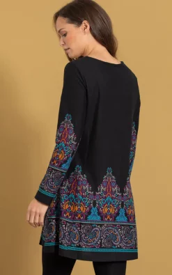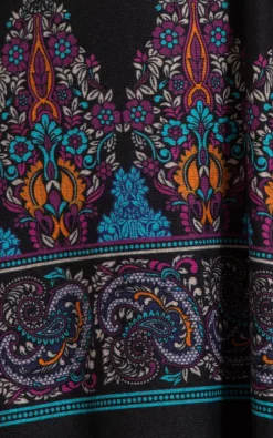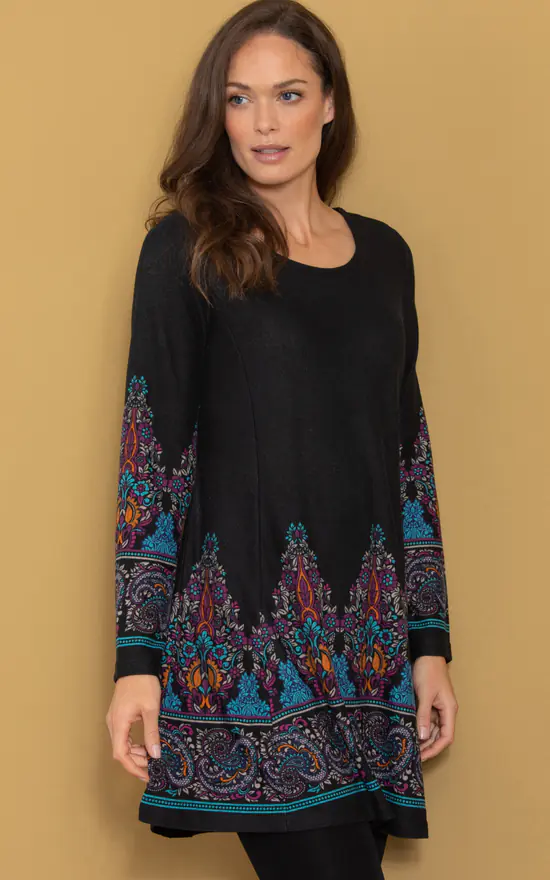 When it comes to wardrobe must haves then you must have our lightweight black brushed knit tunic top in your wardrobe. The panelled cut will fit and flatter your figure and is perfect to pair with leggings or skinny jeans and boots, we have added a round and an eye catching pink and teal border paisley print to the lower part of the garment and long sleeves. Back length to longest point 85cms.