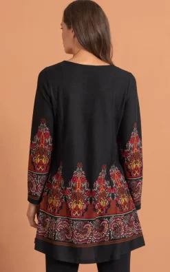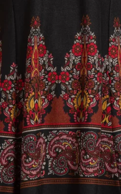 When it comes to wardrobe must haves then you must have our lightweight brushed black knit tunic top in your wardrobe. The panelled cut will fit and flatter your figure and is perfect to pair with leggings or skinny jeans and boots, we have added a round and an eye catching red border paisley print to the lower part of the garment and long sleeves. Back length to longest point 85cms.