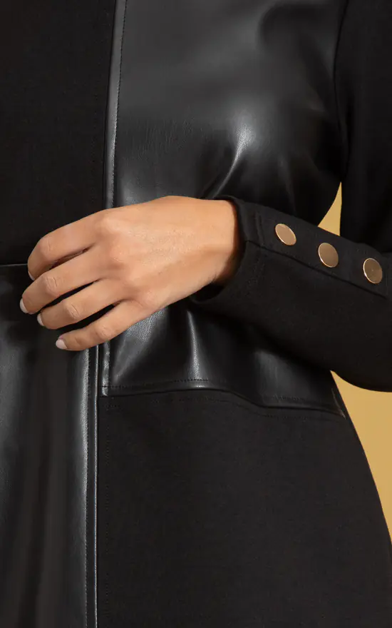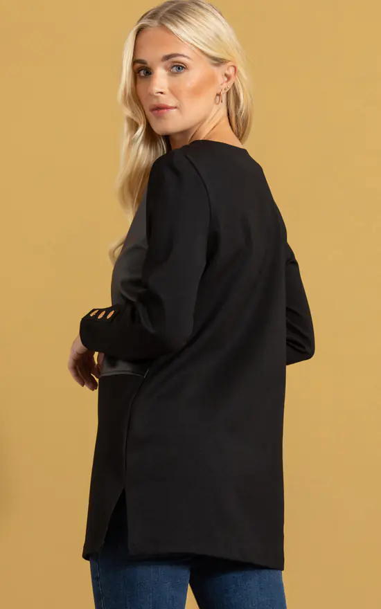 Add a polished finish to your outfit with our patchwork faux leather and ponte tunic top, designed with a round neckline, splits to the side hemline and finished with decorative gold coloured studs to the long sleeves. Back length 72cms.