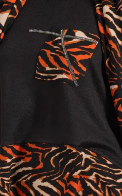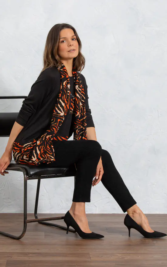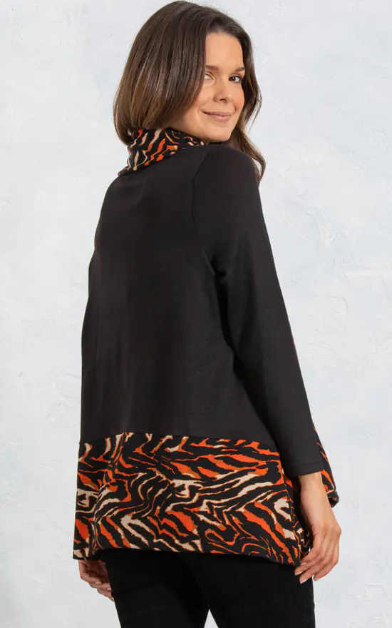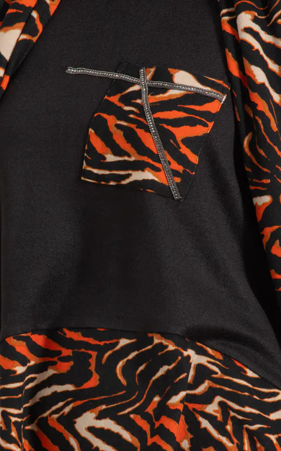 Meet our lovely black knitted tunic that comes with an animal printed dip hem and removable animal print scarf. Relaxed fitting with long sleeves, round neckline and did we mention the addition of the embellished animal printed front patch pocket. Back length 66cms.