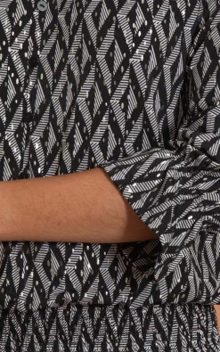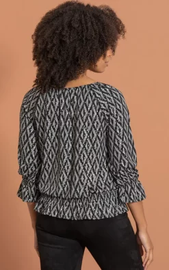 Wear me with jeans or smart trousers to take you through the week in style. Cut from an eye catching diamond printed stretch fabric with a silver coloured foil finish that shimmers in the light. We have added elasticated cuffs to the three quarter length sleeves and just above the hemline for a stylish finish and fit, cut with a round neckline and mock button fastening throughout the front. Back length 64cms.