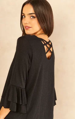 Gorgeous new party arrivals! Our trendy shimmer top features criss cross lattice strap back, oversized 3/4 fluted sleeves and round neck. Fully lined and top quality. A statement addition to your wardrobe.