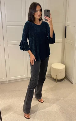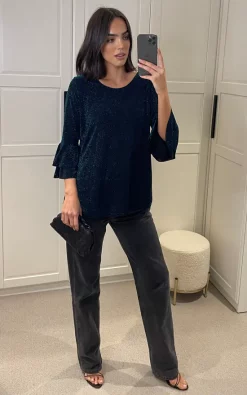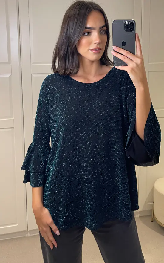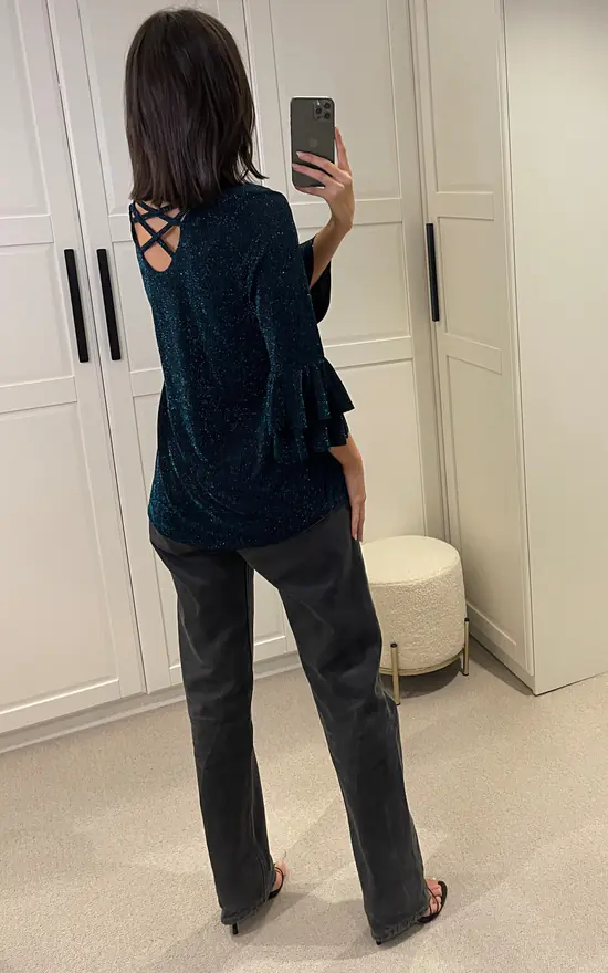 Gorgeous new party arrivals! Our trendy shimmer top features criss cross lattice strap back, oversized 3/4 fluted sleeves and round neck. Fully lined and top quality. A statement addition to your wardrobe.