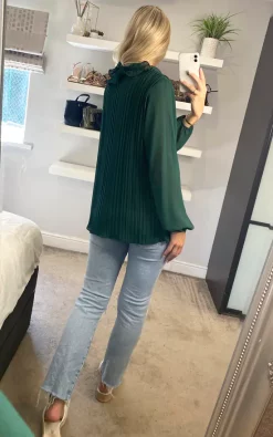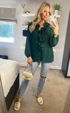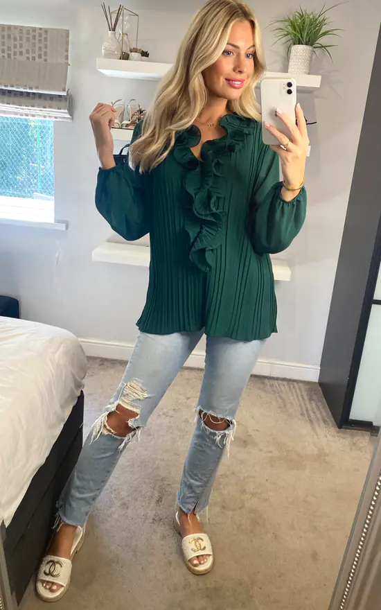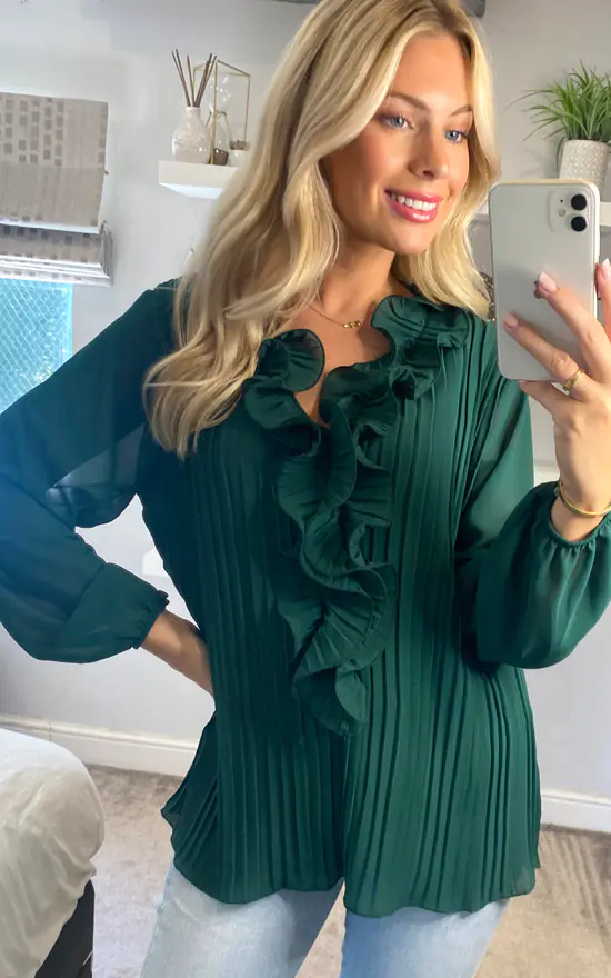 A classy new transitional blouse. Our plain ruffle print blouse can be worn day to night. Fully lined and plissee pleated with stretch for extra comfort and flattering fit. Features long angel sleeves, elasticated cuffs and front ruffle detail. Team with trousers for work or jeans and leggings for going out. Can be worn open or closed.