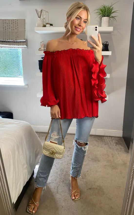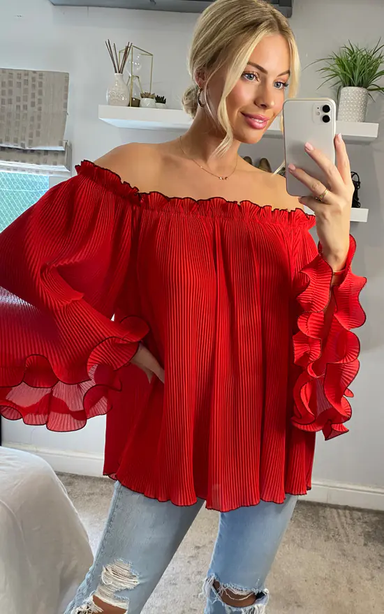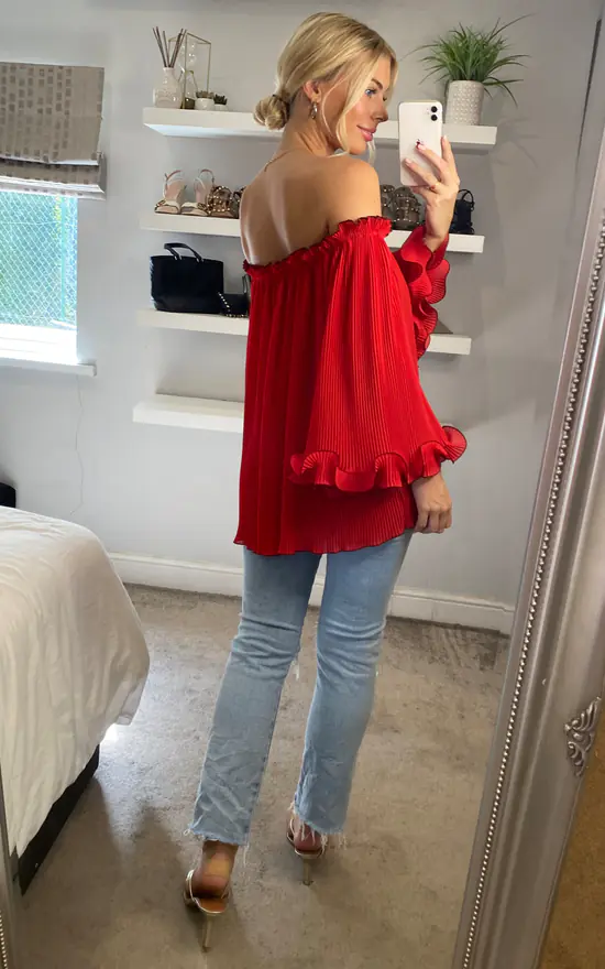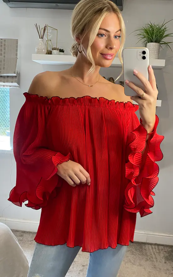 Simple yet stylish! Our best selling pleated blouse now in long sleeve. This frill edged, fully lined, plissee pleated bardot blouse is a wardrobe essential! Features long sleeves with contrast stitch and can be styled on or off the shoulder.