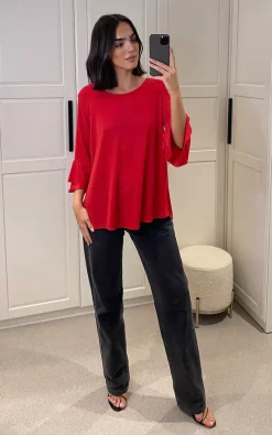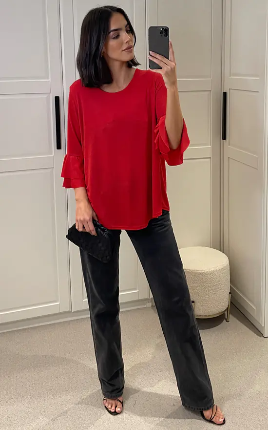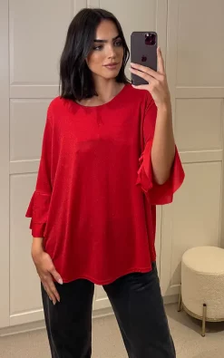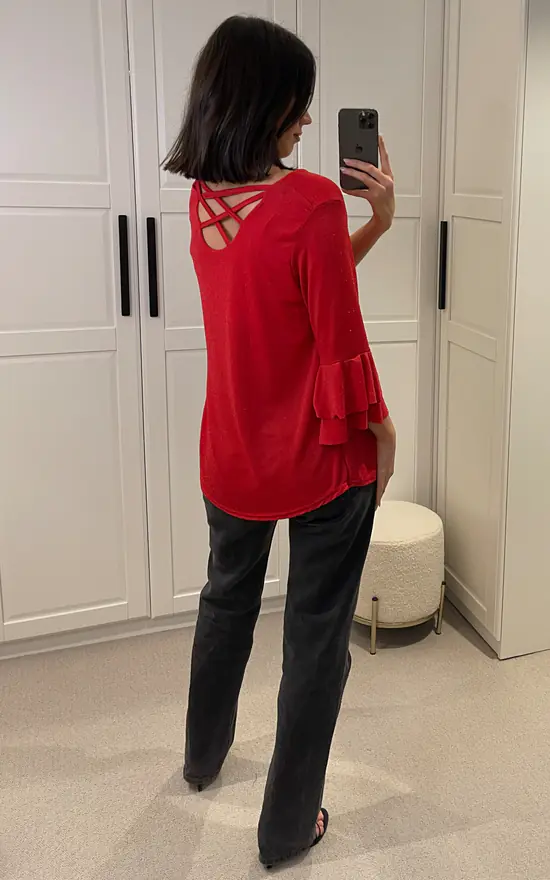 Gorgeous new party arrivals! Our trendy shimmer top features criss cross lattice strap back, oversized 3/4 fluted sleeves and round neck. Fully lined and top quality. A statement addition to your wardrobe.