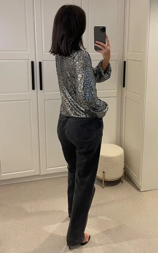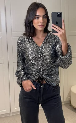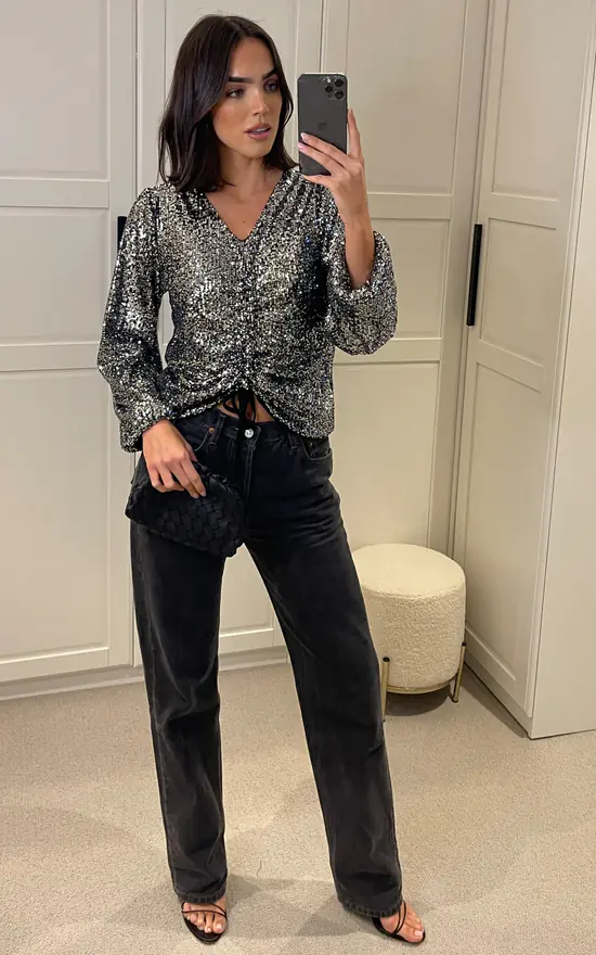 Stunning new party season arrivals! Our fully sequin, long sleeve V neck blouse features adjustable rouched tie front and elasticated cuffs. Layer with our PU leggings and boots. A luxury, top quality addition to your wardrobe! Perfect for parties and nights out.