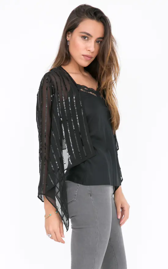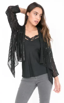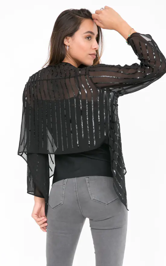 A relaxed-fitting bolero in black with sequins, featuring 3/4 sleeves and a waterfall front that you can leave open or tie up