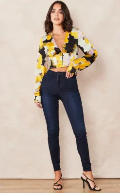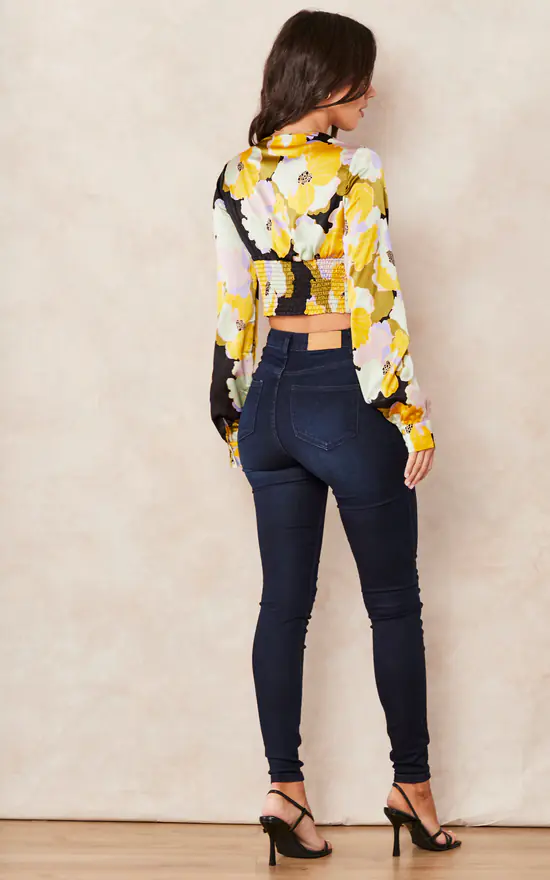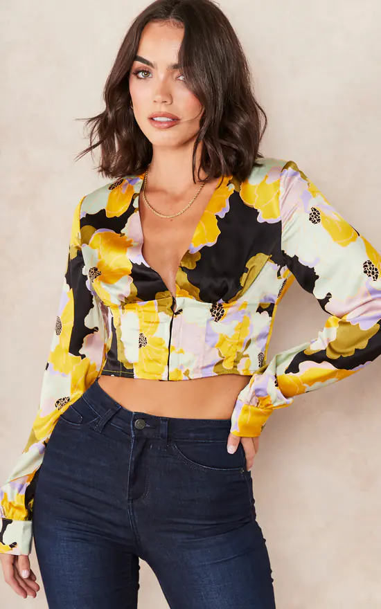 This beautiful structured cropped top is perfect statement piece to dress up or down this Autumn/Winter. Pair with a pair of jeans and boots for a smart casual look or with a floaty maxi skirt for a more relaxed yet elegant look. The abstract leaf print includes a variety of collage like leaves with different textures in a mixture of warm and cool tones against a moss green background.