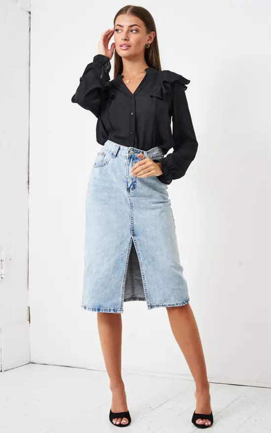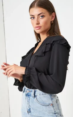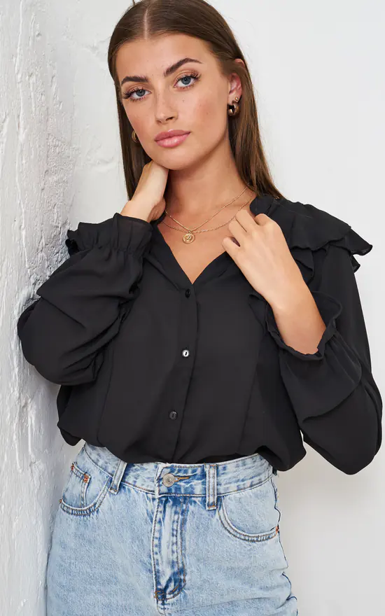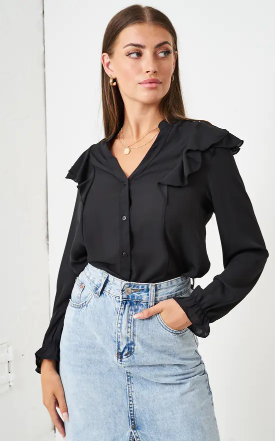 The ‘Raelyn’ blouse from Love Frontrow takes romantic ’70s references into this piece. This blouse is cut from sheer black chiffon in a relaxed fit and has a floaty V-shaped overlay and ruffles at the neckline, shoulders and cuffs. Wear yours tucked into high waist jeans or skirt.