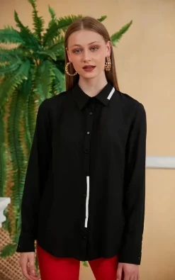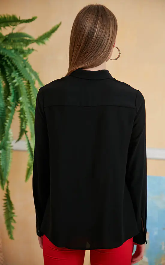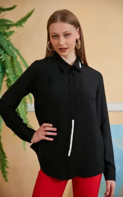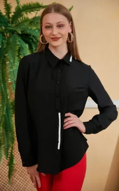 Long sleeves with white detail in front our comfortable fit black shirt is very popular. Perfect for events, work, cocktail and meetings. White elastic detail in front make it more attractive and you can match great with any colour trousers, jeans or pencil skirts.