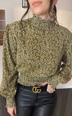 This elegant top is made from lightweight crepe de chine printed with olive leaves. It has puffed sleeves and is elasticated at the waist and cuffs. Style yours with cowboy boots, chunky sneakers or combat boots.