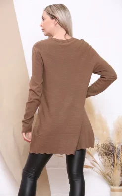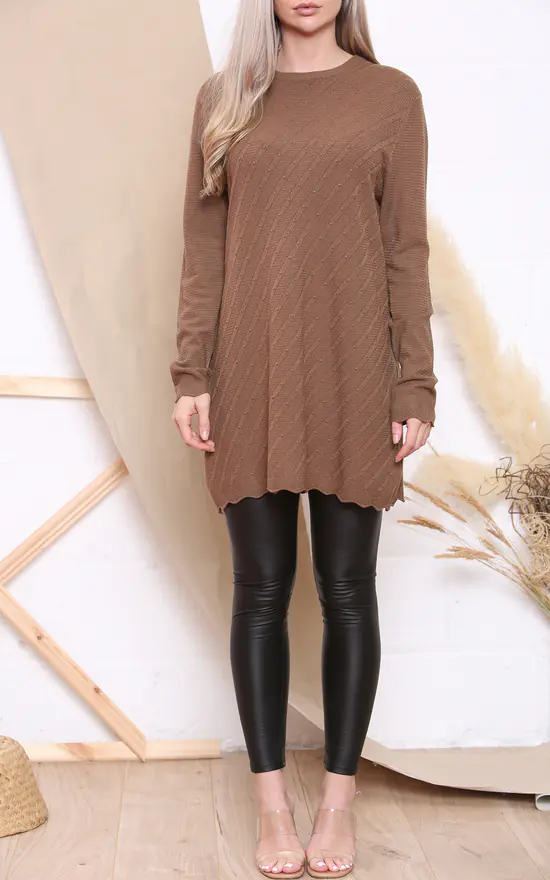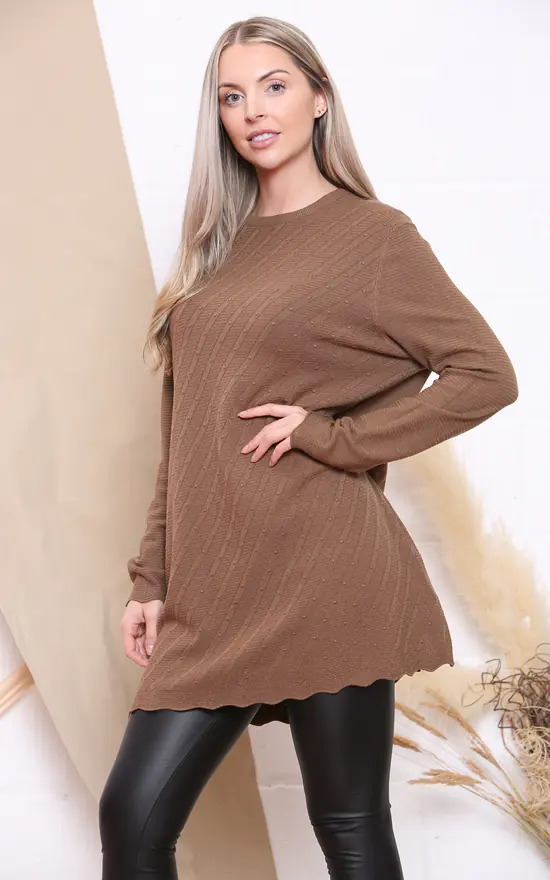 This smart top has a stylish textured pattern of dots and ribs in a diagonal striped pattern. Cuffs and hem have a wavy trim to add extra style to the top. Long sleeves and comfortable fit are perfect for winter.
