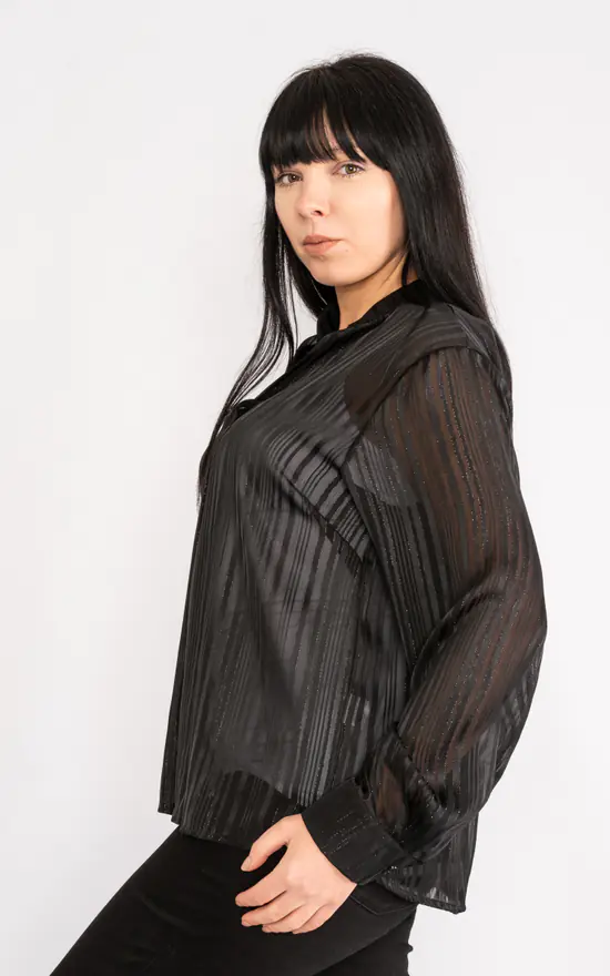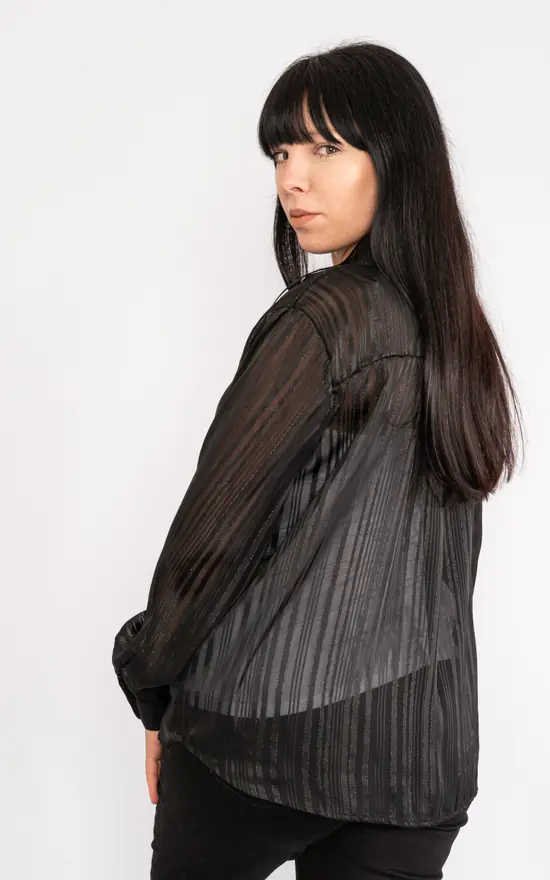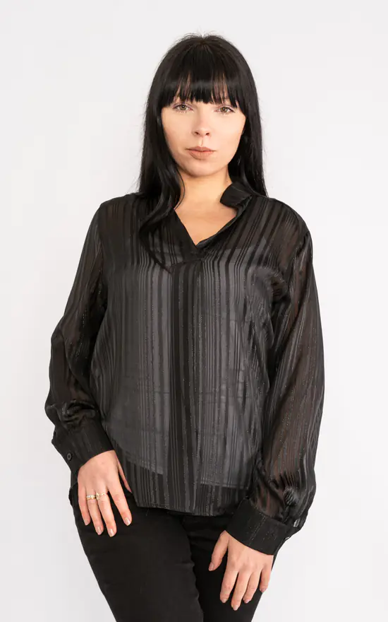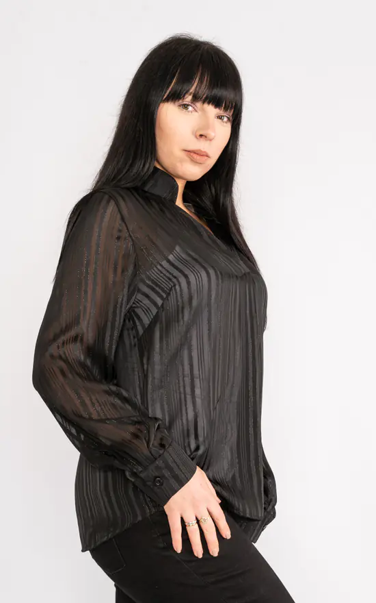 Lightweight chiffon blouse with mandarin collar and overlapping open neck.