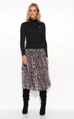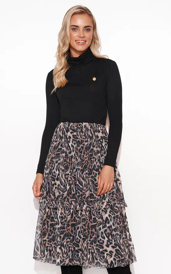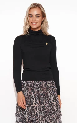 Elegant women’s blouse with turtleneck and crease located at the top. The blouse has long classic sleeves. Its cut is sewn close to the body, so it emphasises the feminine bust. In the front part, on the side, a charming gold plate has been sewn in. The turtleneck, especially at the back, also shows creases. The blouse is available in four colour options: beige, dirty pink, khaki and black. Pair it with your favourite fitted skirt. Wear with a blazer and present chic in true business style.