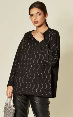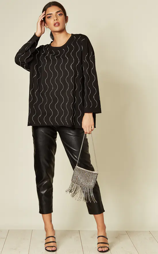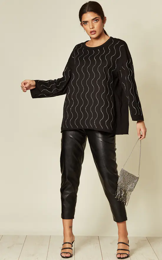 Easily dressed up or down, this soft cotton top features crystal coloured stones in a swirly all over design to the front only. Team with leggings for a more low key casual look or wear with your favourite heels to take you into the evening.
