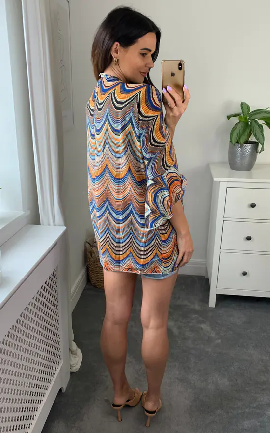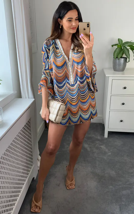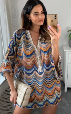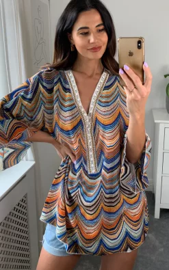 For gorgeous, cool, breezy summer outfits, floaty kaftan tops are a great addition to every girls wardrobe. Can be styled with shorts, linens, skinnies or simply a glamourous throw on over your swimwear. For that extra boho vibe this top is beautifully embellished with bead work to the front neck line and complimented with fluted sleeves. It is crafted from a chiffon fabric and features an all aztec print. Will fit from a size 10 to a 16 depending on the look you are wanting to achieve.