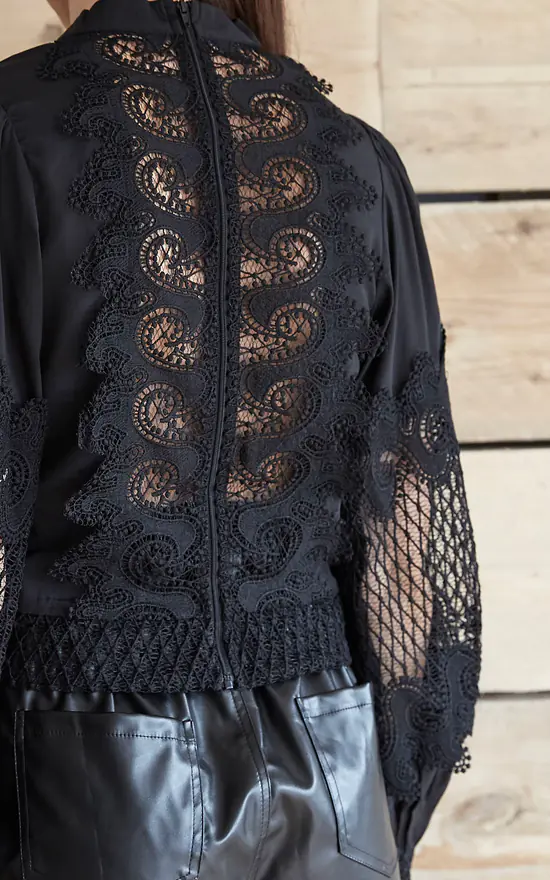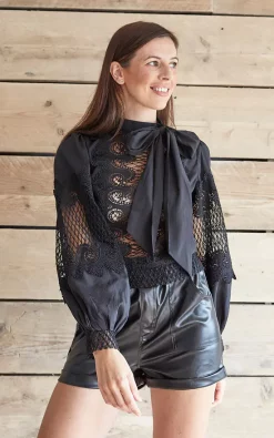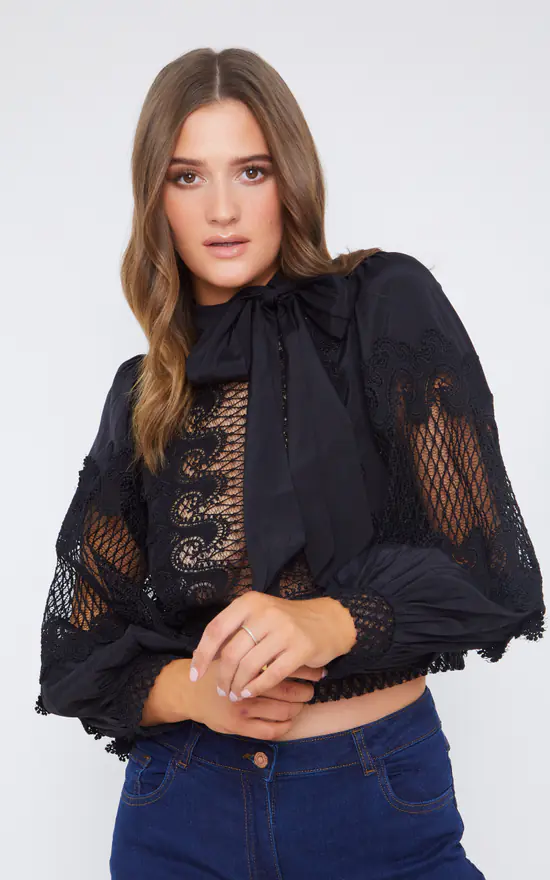 Luxe black blouse has lace panelling to the front, back and bell sleeve with button cuff. The high neck has a pussy bow and full zip to the back. Wear with shorts, trousers or jeans.