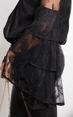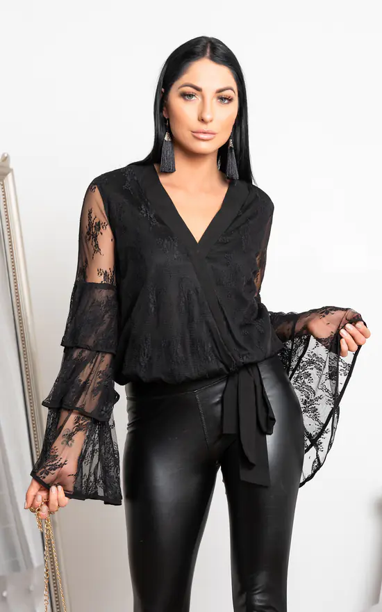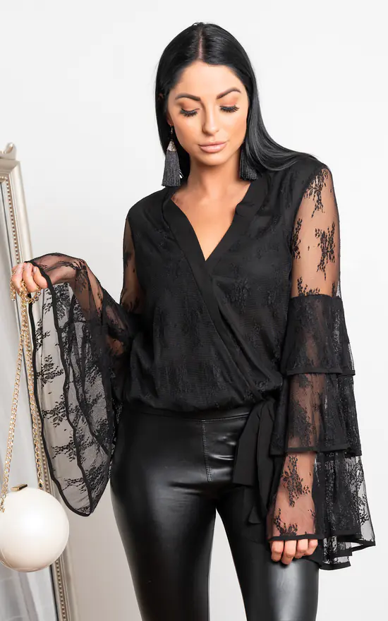 Stunning wrap over blouse with over sized flare lace effect sleeves.