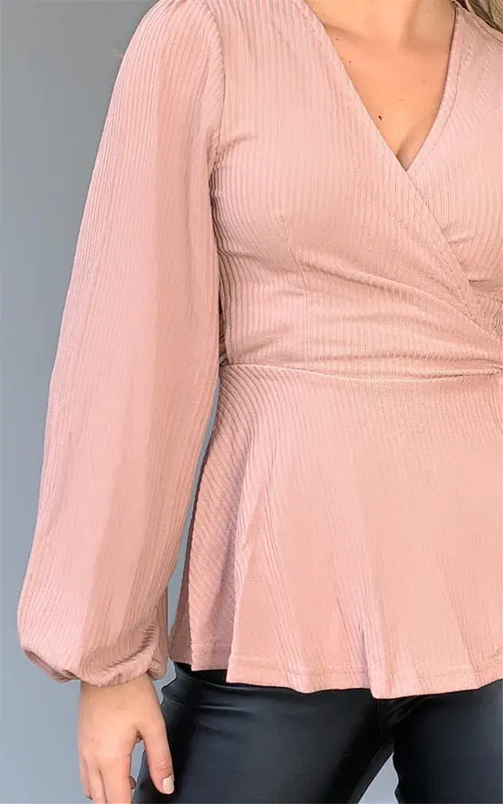 Beautiful long lantern sleeve plain colour ruffle hem wrap top in beige , perfect every day top for cool weather, winter, or just casual mix and match