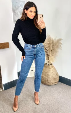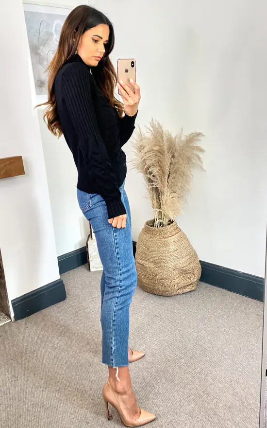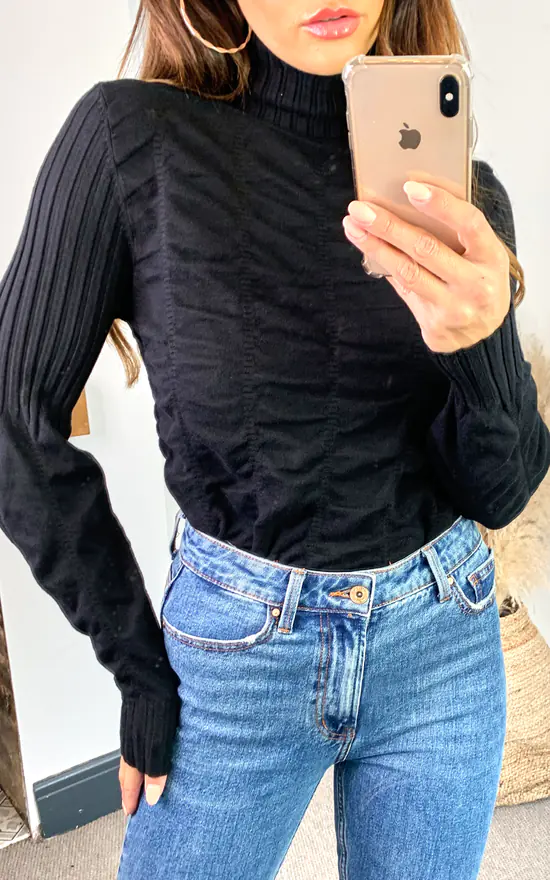 Black ruched body long sleeve knitted top with ribbed roll neck
