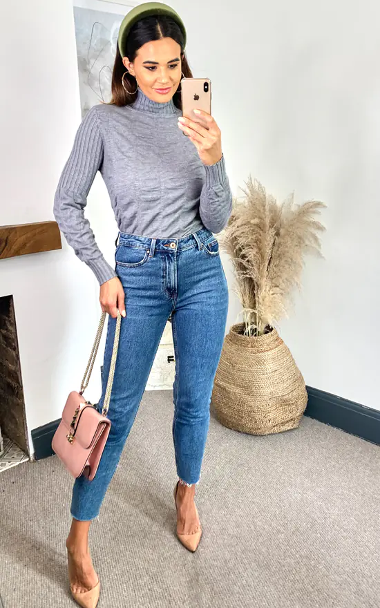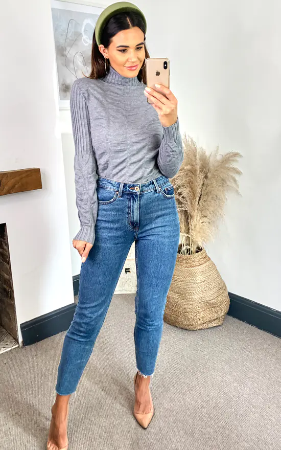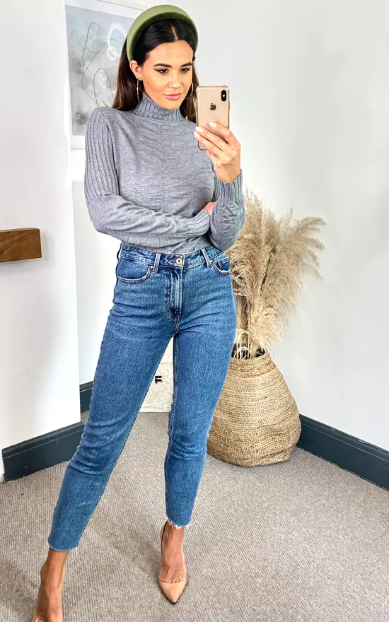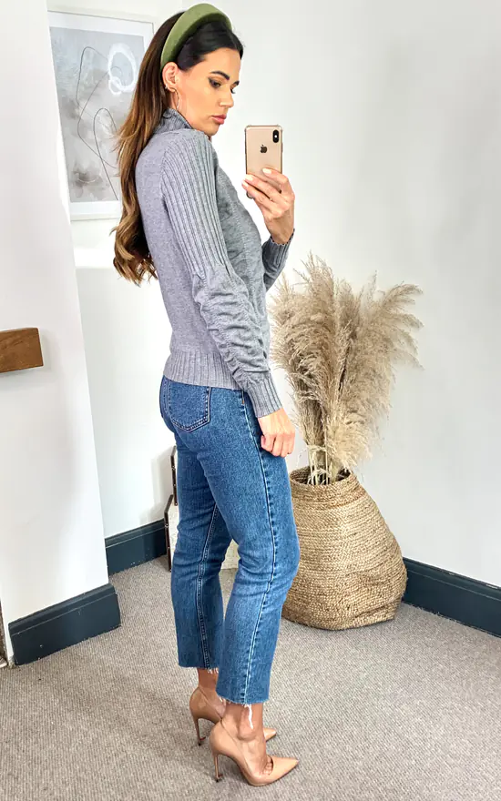 Grey ruched body long sleeve knitted top with ribbed roll neck