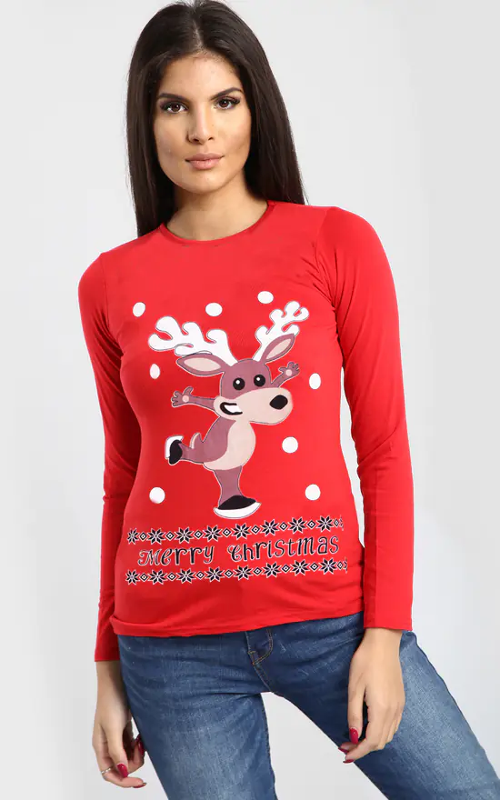 Enjoy and glam this X-Mas Season in our Elsie Christmas Dancing Reindeer Print Long Sleeve T-Shirt In Red, featuring graphic print of Dancing Reindeer Print on a Soft and Comfortable Material.