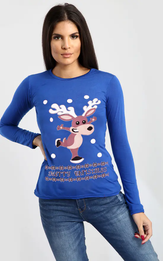 Enjoy and glam this X-Mas Season in our Elsie Christmas Dancing Reindeer Print Long Sleeve T-Shirt In Royal Blue, featuring graphic print of Dancing Reindeer Print on a Soft and Comfortable Material.