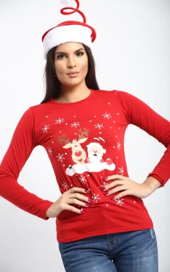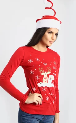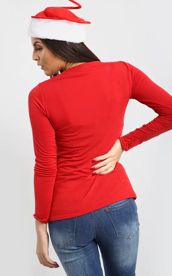 Enjoy and glam this X-Mas Season in our Elsie Christmas Reindeer & Santa Print Long Sleeve T-Shirt In Red, featuring graphic print of Reindeer & Santa Print on a Soft and Comfortable Material.